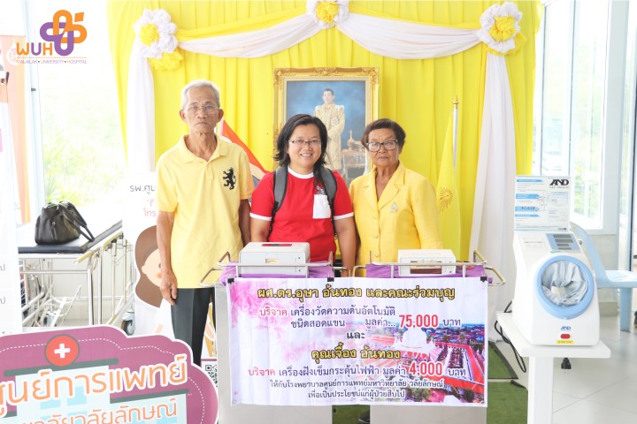 เมื่อวันที่ 25 กรกฎาคม 2562 เวลา 09.00 น. คุณอุษา อ้นทอง คุณเจื้อง อ้นทองและครอบครัว ร่วมบริจากเครื่องวัดความดันอัตโนมัติ ชนิดสอดแขน มูลค่า 75,000 บาท และเครื่องฝั่งเข็มกระตุ้นไฟฟ้า มูลค่า 4,000 บาท ให้กับกองทุนพัฒนาโรงพยาบาลศูนย์การแพทย์มหาวิทยาลัยวลัยลักษณ์ โดยมี อาจารย์ พญ.อภิญญา รัตนสุวรรณ และบุคลากร รพ.ศูนย์การแพทย์เป็นผู้รับมอบ