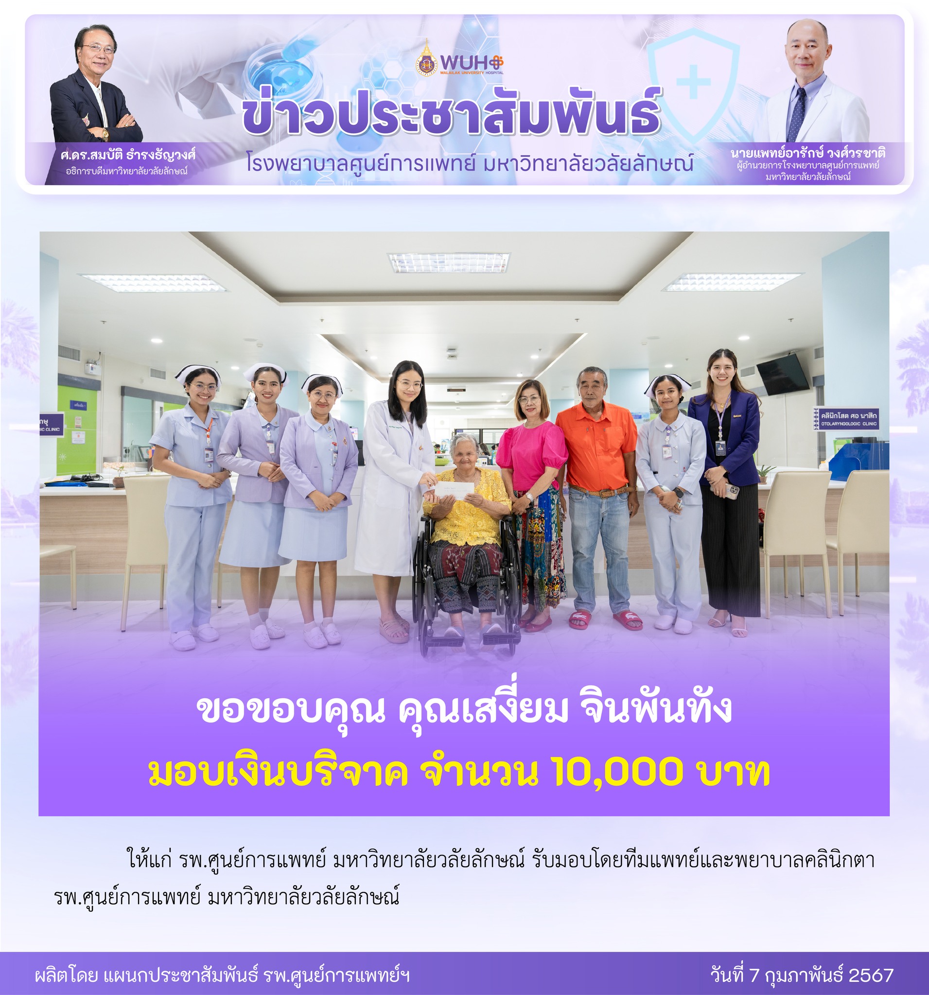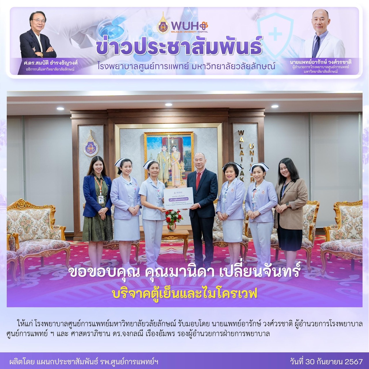 ขอขอบคุณ คุณมานิดา เปลี่ยนจันทร์ บริจาคตู้เย็นและไมโครเวฟ ให้แก่ โรงพยาบาลศูนย์การแพทย์ฯ รับมอบโดย นายแพทย์อารักษ์ วงศ์วรชาติ ผู้อำนวยการโรงพยาบาลศูนย์การแพทย์ ฯ และ ศาสตราภิชาน ดร.จงกลณี เรืองอัมพร รองผู้อำนวยการฝ่ายการพยาบาล
